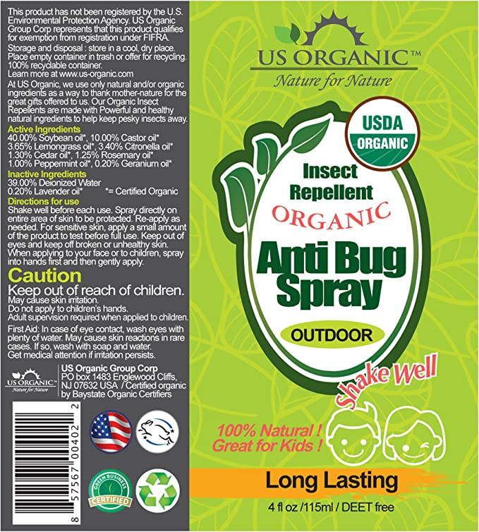 US Organic Organic Mosquito Repellent Anti Bug Outdoor Pump Sprays, 4 Ounces, Certified Organic, Proven Results by lab Testing, deet-Free